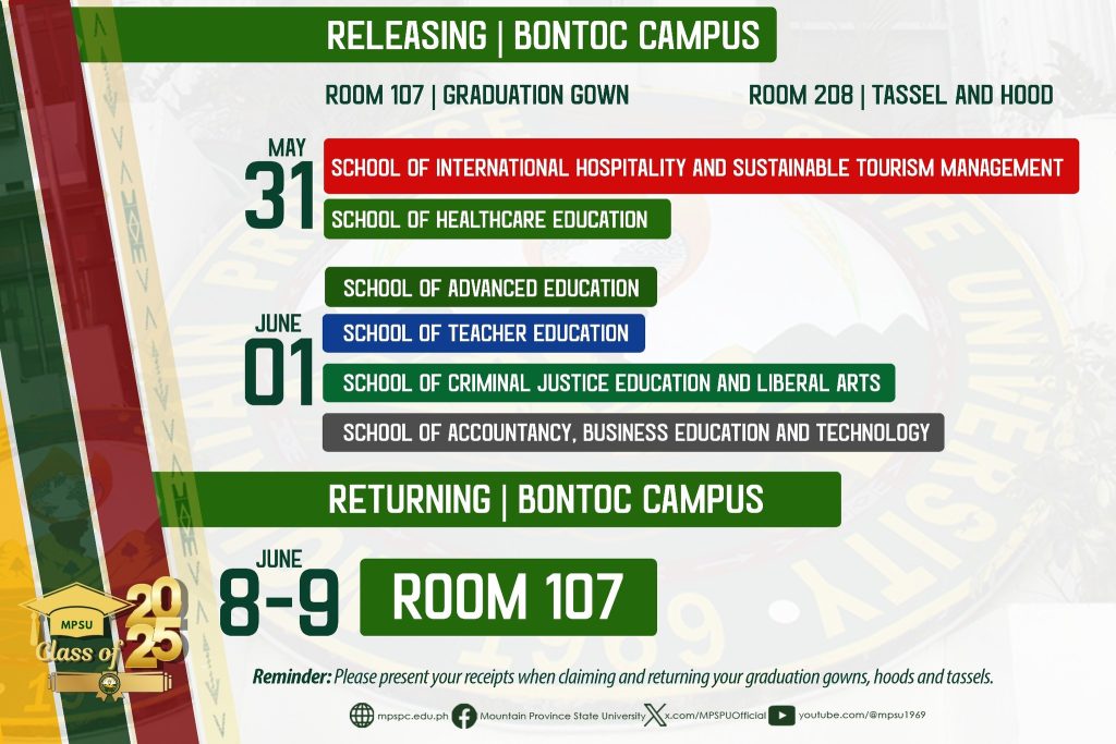 All graduands from Bontoc and Tadian campuses are advised to refer to the posted schedule for the claiming and returning