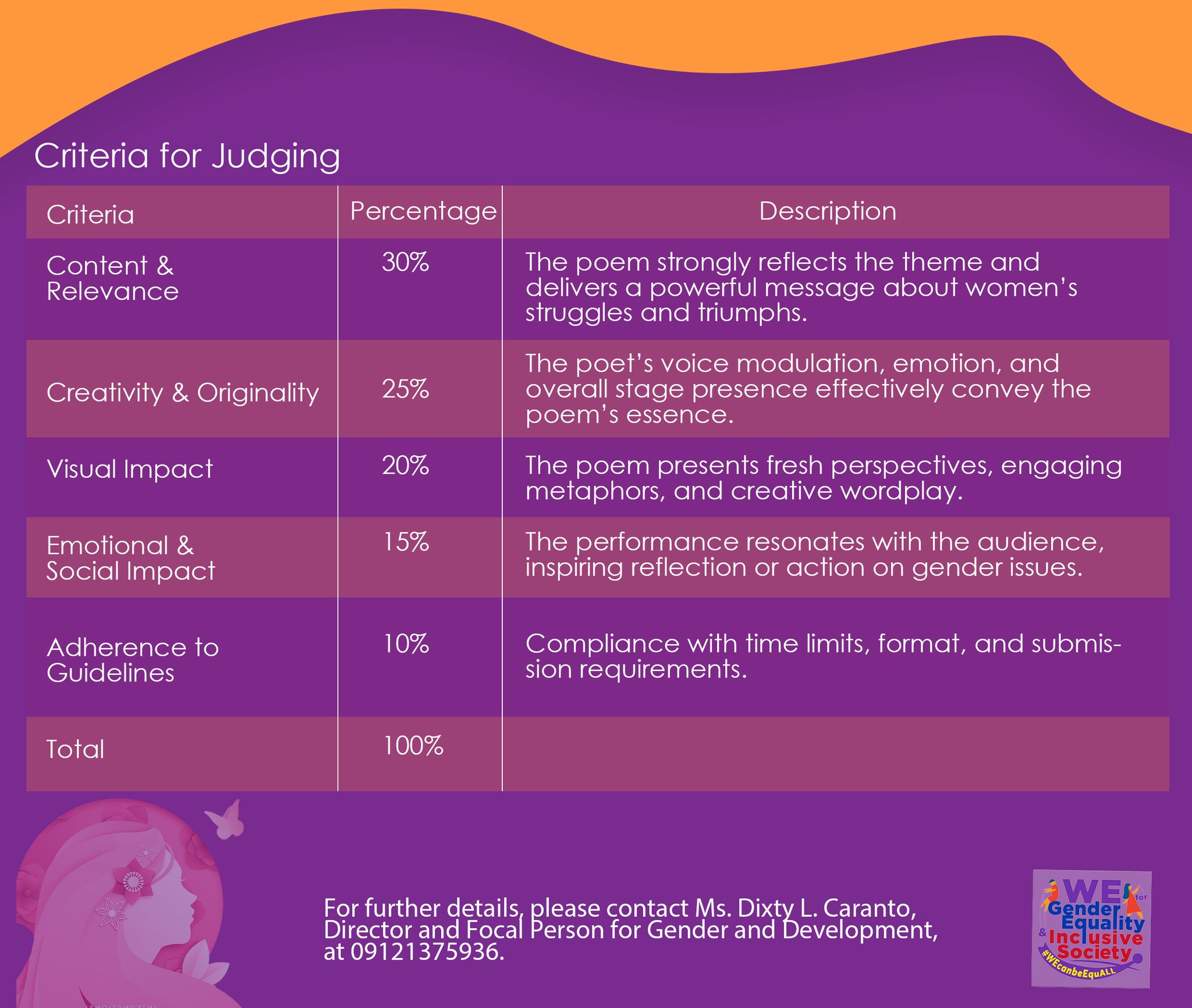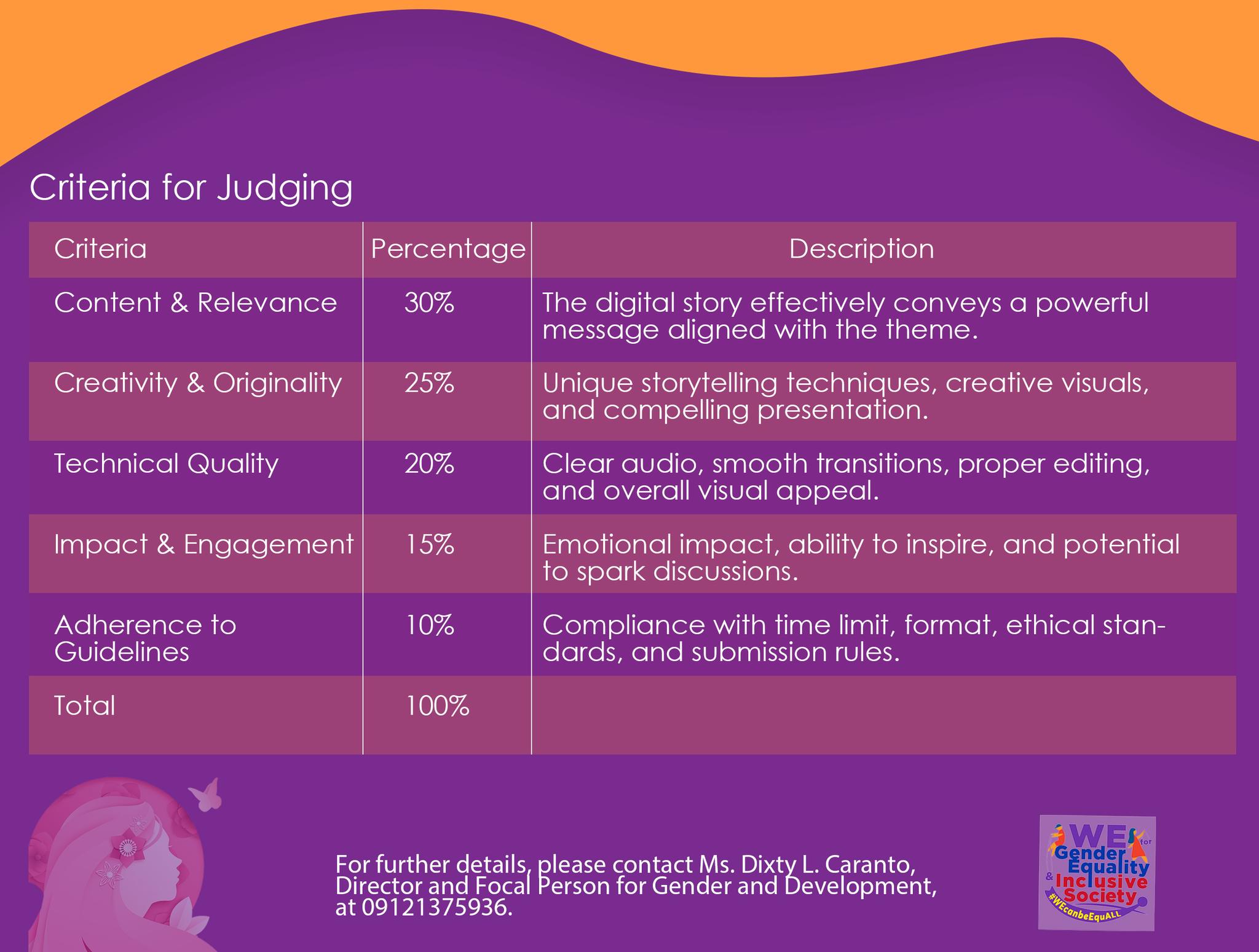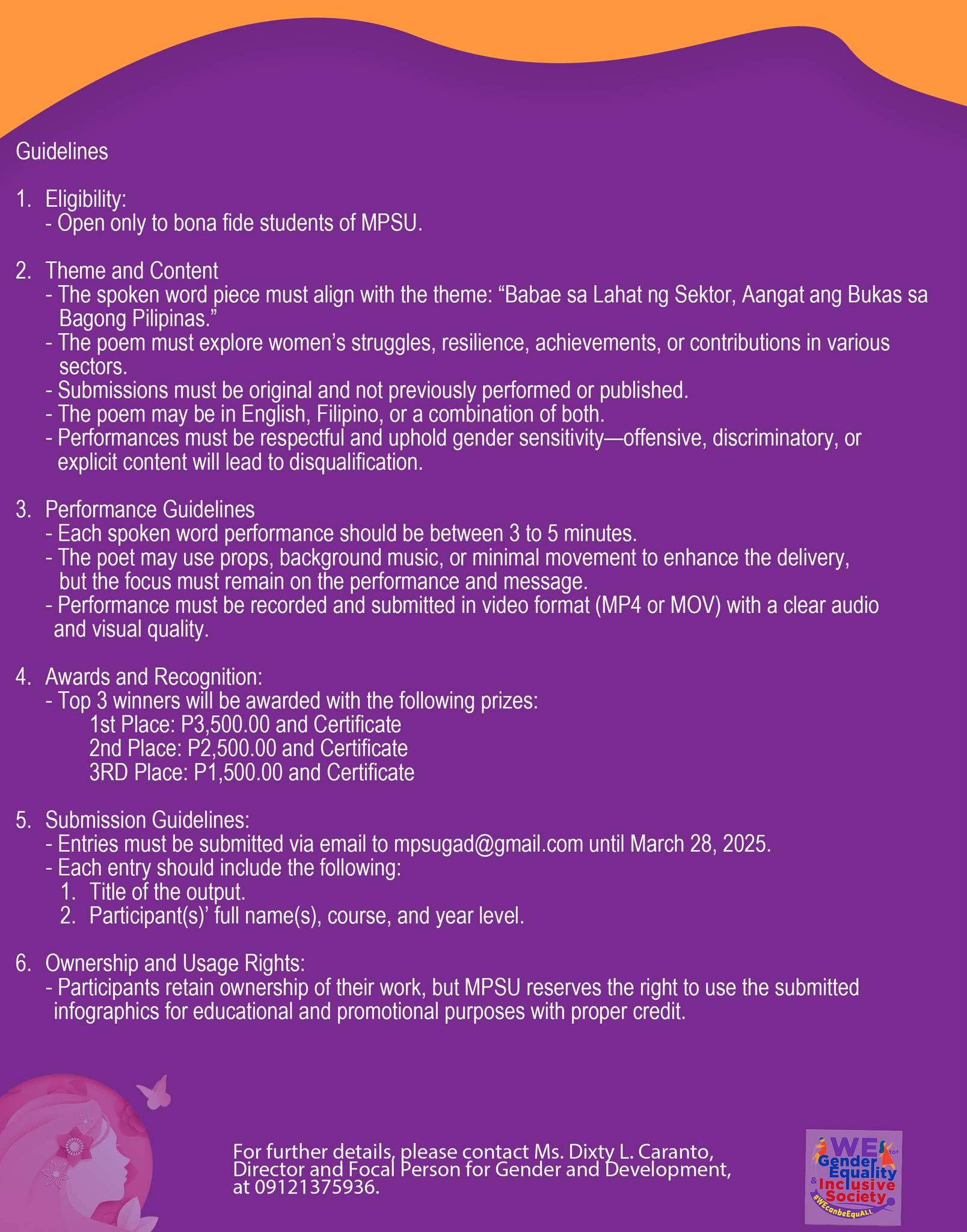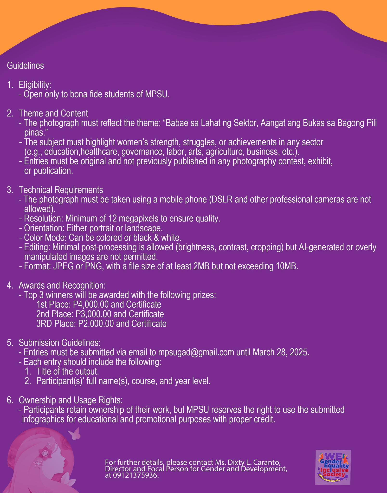 For further details, please get in touch with Ms. Dixty L. Caranto, Director and Focal Person for Gender and Development, at 09121375936.