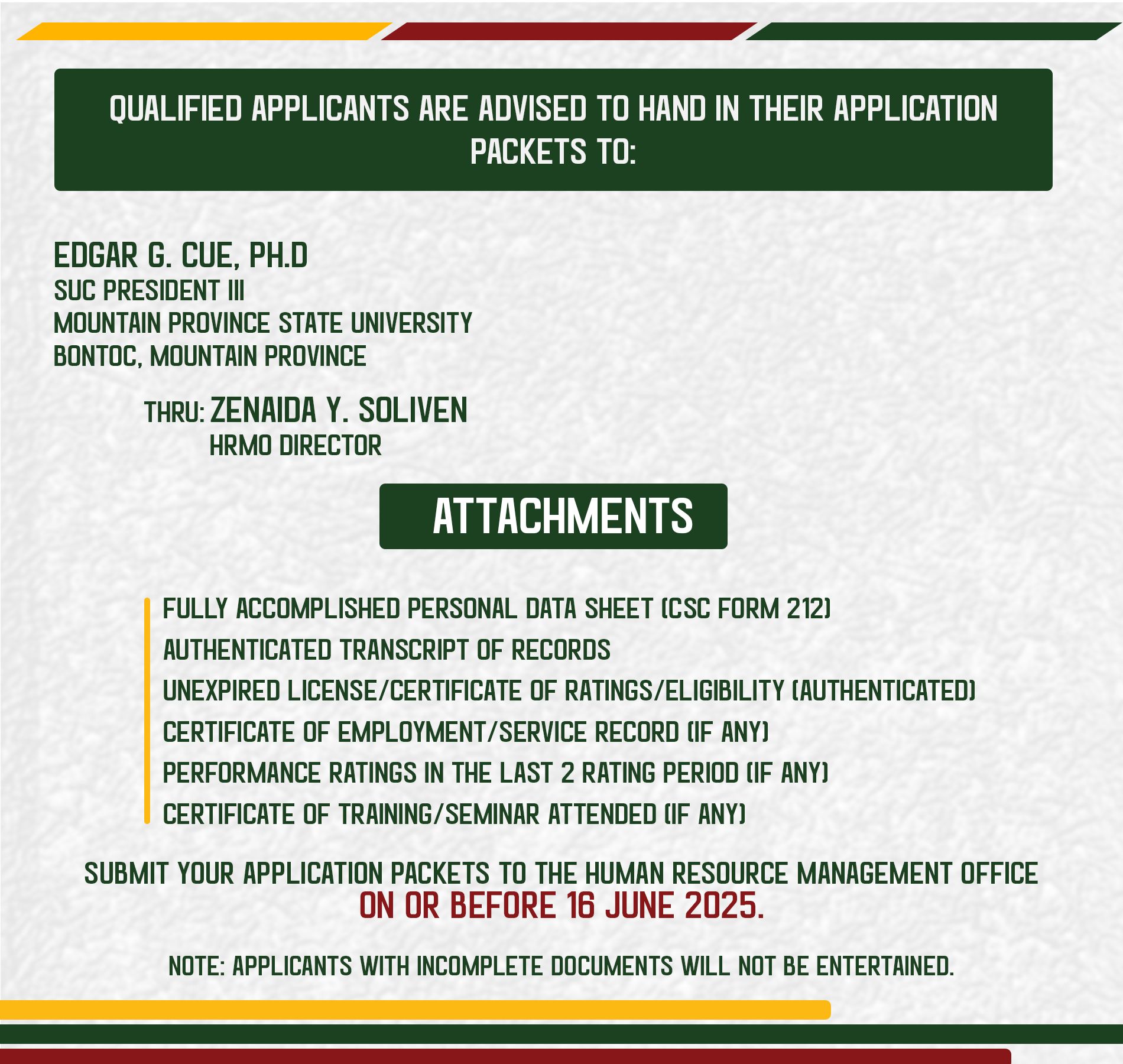 Submit your application packets to the Human Resources Management Office on or before 16 June 2025.