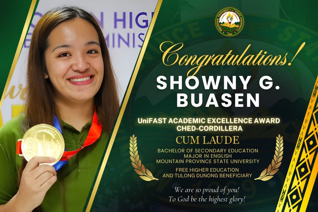 CHED-CAR Regional Office, La Trinidad, Benguet— Ms. Showny G. Buasen, who recently graduated as Cum Laude from the University, proudly received the UniFAST Academic Excellence Award from the Commission on Higher Education-Unified Student Financial Assistance System for Tertiary Education (CHED-UNIFAST) on 18 August 2025.