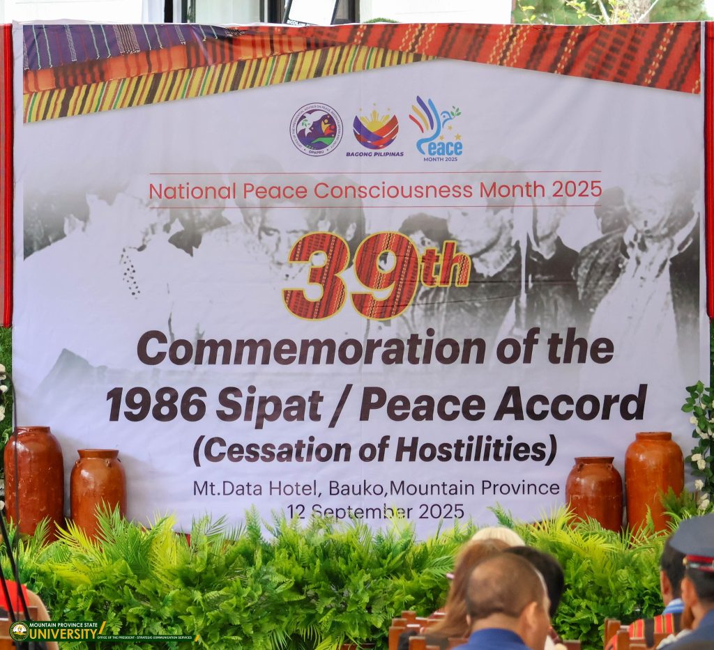 University President Dr. Edgar G. Cue represented by Vice President for Academic Affairs Dr. Geraldine L. Madjaco, Vice President for Administration and Finance Mr. Reynaldo P. Gayo Jr., Chief Administrative Officer Atty. Dexter C. Lingbanan and MPSU Tadian Administrator Dr. Brent Greg E. Gomuad attended the 39th Commemoration of the 1986 Sipat/ Peace Accord (Cessation of Hostilities), held in celebration of the National Peace Consciousness Month 2025 at Mount Data Hotel, Mount Data, Bauko, Mountain Province today, September 12.