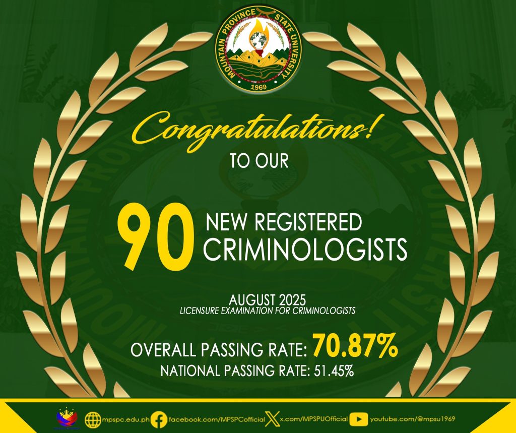 90 out of 127 students from the University were among the 13,074 out of 25,410 passers of the examination given by the Board of Criminology last August 2025 in 29 testing centers all over the Philippines.