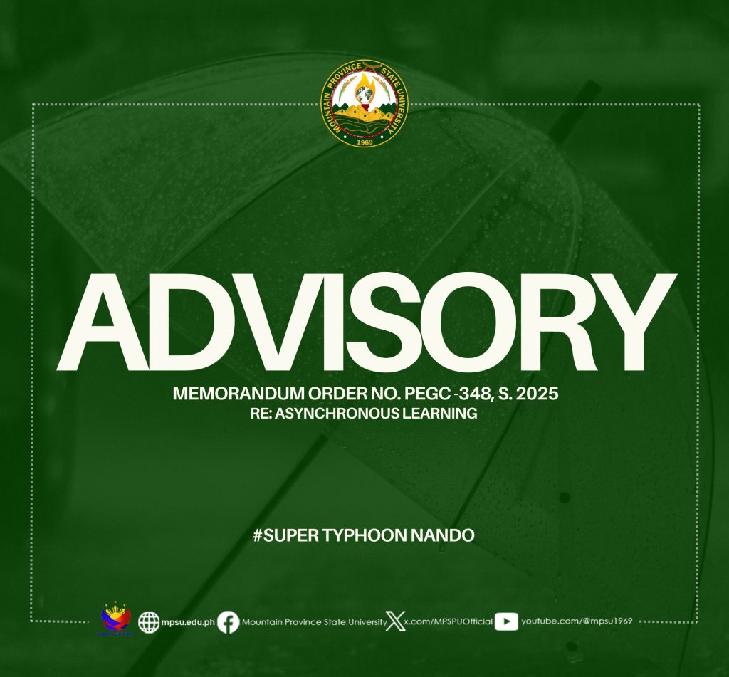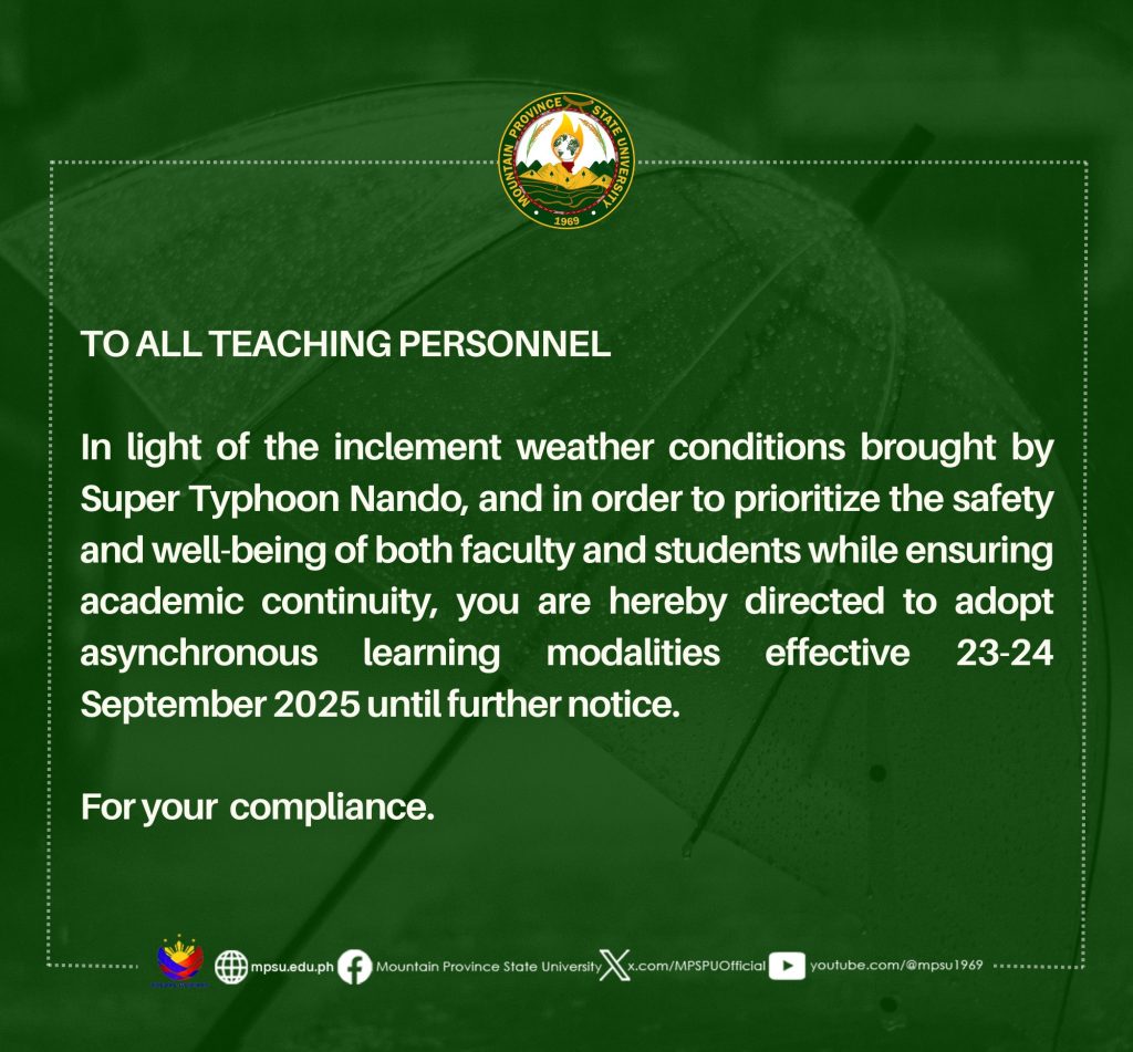 In light of the inclement weather conditions brought by Super Typhoon Nando, and in order to prioritize the safety and well-being of both faculty and students while ensuring academic continuity, you are hereby directed to adopt asynchronous learning modalities effective 23-24 September 2025 until further notice.