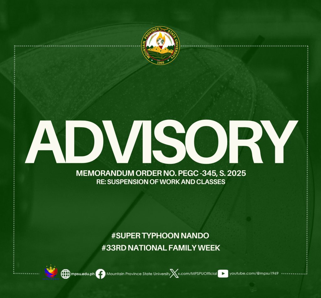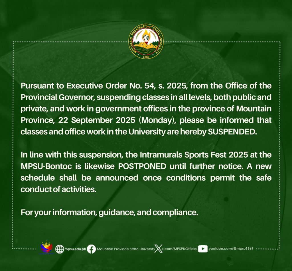 Pursuant to Executive Order No. 54, s. 2025, from the Office of the Provincial Governor, suspending classes in all levels, both public and private, and work in government offices in the province of Mountain Province, 22 September 2025 (Monday), please be informed that classes and office work in the University are hereby SUSPENDED.