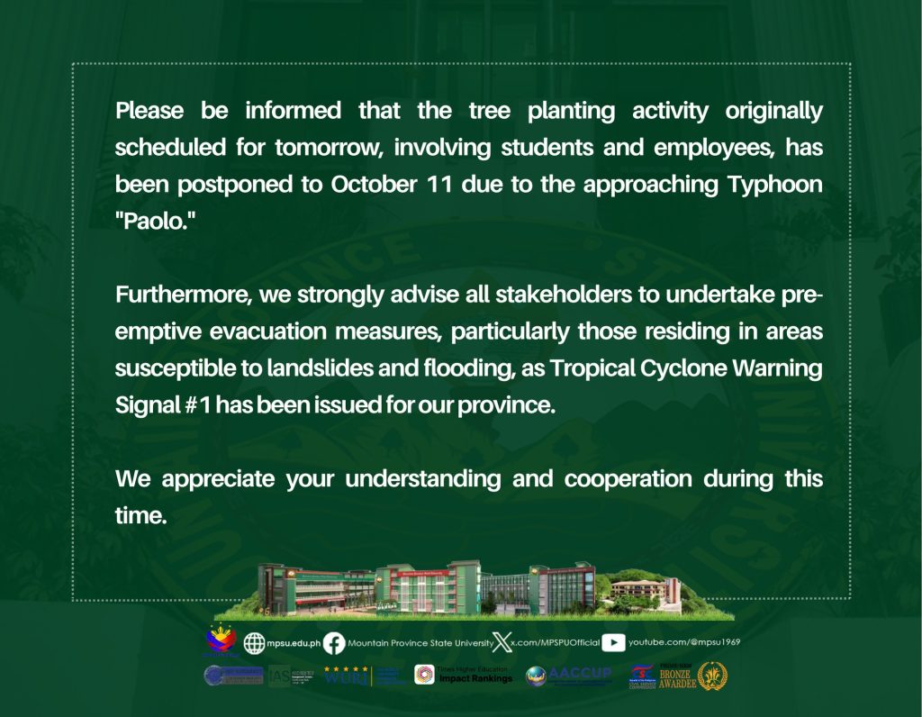 𝗔𝗗𝗩𝗜𝗦𝗢𝗥𝗬|| Please be informed that the tree planting activity originally scheduled for tomorrow, involving students and employees, has been postponed to October 11 due to the approaching Tropical Storm Paolo.