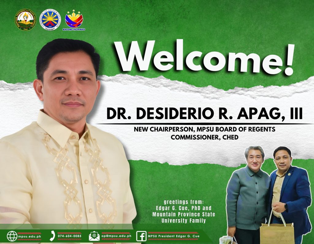 Mountain Province State University (MPSU), through the leadership of University President Dr. Edgar G. Cue, extends its warmest congratulations to Hon. Desiderio R. Apag III, Commissioner of the Commission on Higher Education, on his appointment as the new Chairperson of the MPSU Board of Regents.