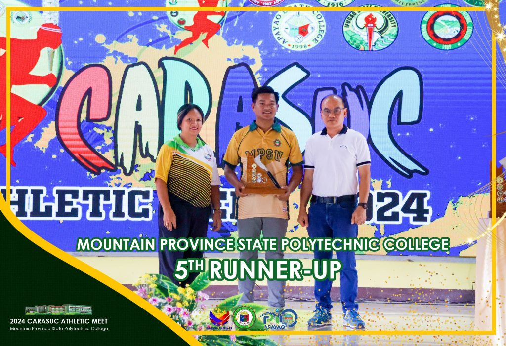 The MPSPC Warriors secured the sixth place during the recently held Cordillera Administrative Region Association of State Universities and Colleges (CARASUC) Athletic Meet in Luna, Apayao from April 28 to May 3, 2024. Vice President for Administration and Finance Mr. Reynaldo P. Gayo, Jr. received the award in behalf of the College.