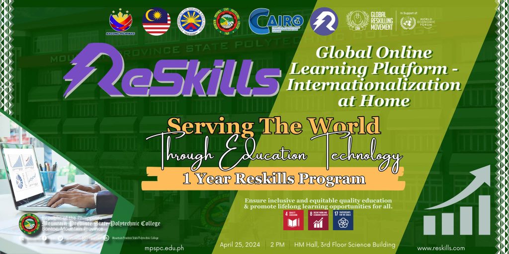 As an implementation of the MOA signing held between the Global Reskilling Movement (GRM) and the Cordillera Association of International Relations Officers (CAIRO), the Reskills Global Online Learning Platform-Internationalization at Home Orientation was conducted to endorsed 100 students from both MPSPC Bontoc and Tadian campuses.