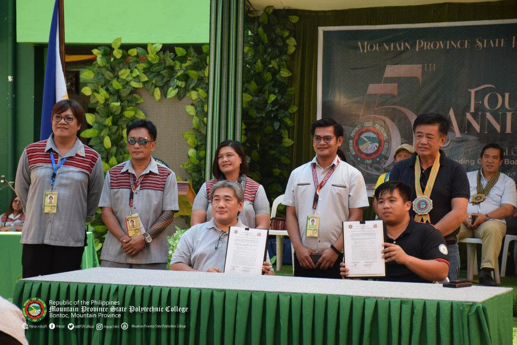 The Mountain Province State Polytechnic College led by College President Dr. Edgar G. Cue signed a Memorandum of Understanding with the Sangguniang Kabataan Federation of Mountain Province represented by its President Mr. Ken Paulo P. Nacnas yesterday, April 12, 2024, during the commemoration of the Collegeโs 55th Founding Anniversary.