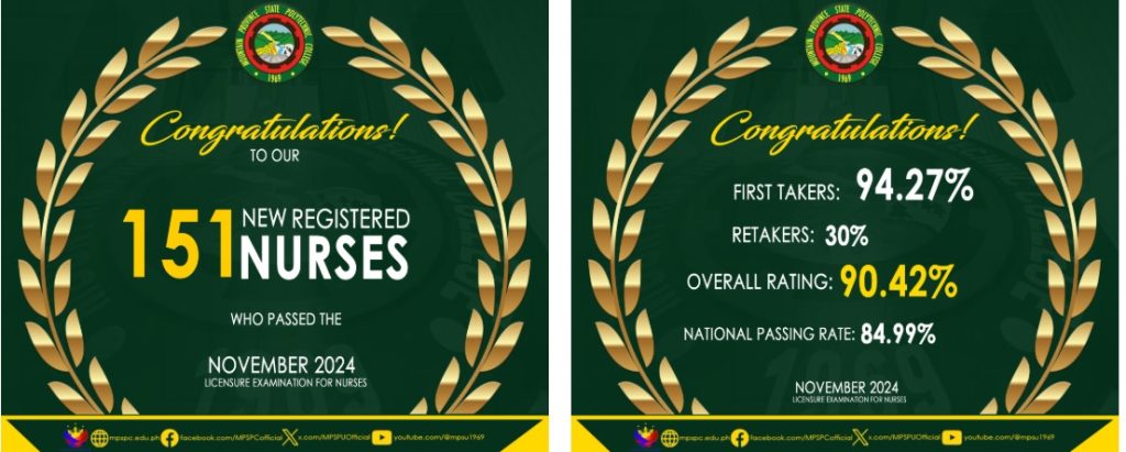 Congratulations to the 148 out of 157 (94.27%) passers of the November 2024 Licensure Examination for Nurses! MPSU once again surpassed the National Passing rate of 84.99%, demonstrating exceptional dedication and excellence. This outstanding achievement is a testament to our nursing students’ hard work, perseverance, and long hours of preparation and to the Universityโs commitment to quality education.