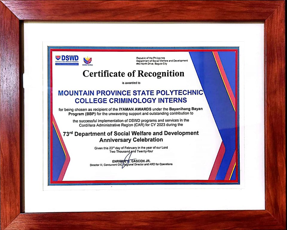 The Criminology interns of Mountain Province State Polytechnic College (MPSPC) received a Certificate of Recognition from the Department of Social Welfare and Development (DSWD) during the 73rd DSWD Anniversary Celebration today, February 23, at the Newtown Plaza Convention Center, Baguio City.