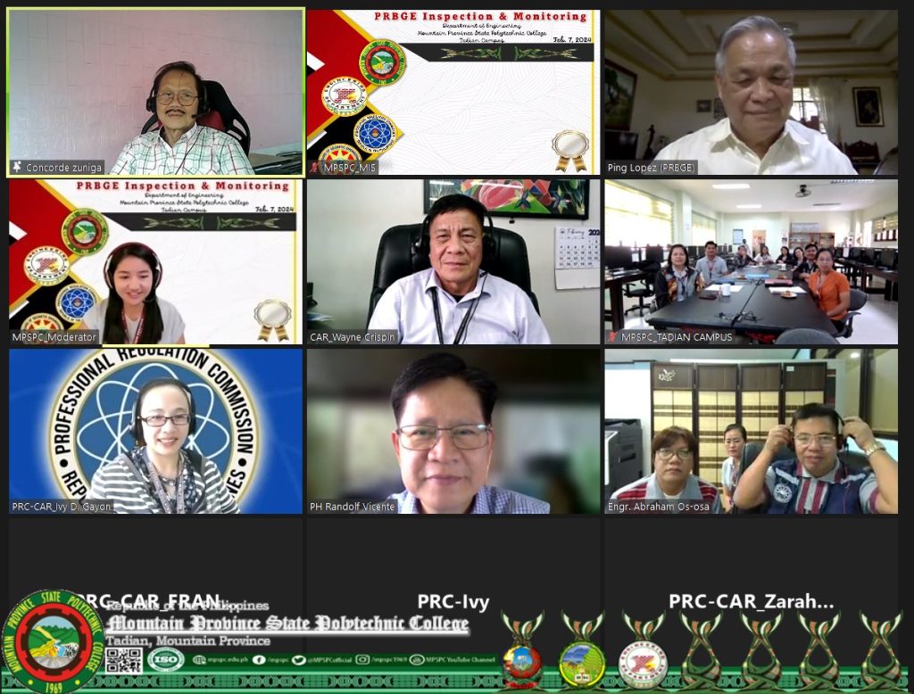 The Professional Regulatory Board of Geodetic Engineering (PRBGE)-CAR with its team members Engr. Epifanio D. Lopez, Engr. Concordio D. Zuñiga, Engr. Randolf S. Vicente, Ms. Ivy D. Gayon together with the CHED representative, Engr. Abraham P. Os-osa recently inspected and monitored virtually the BSGE program.