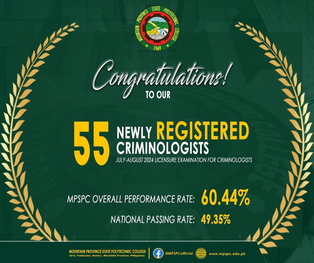 MPSPC congratulates its 55 newly Registered Criminologists (45 first-timers and 10 repeaters), who are among the 11,121 out of 22,539 passers of the July-August 2024 Licensure Examination for Criminologists, which took place from July 31, 2024-August 2, 2024, across testing centers in the country.