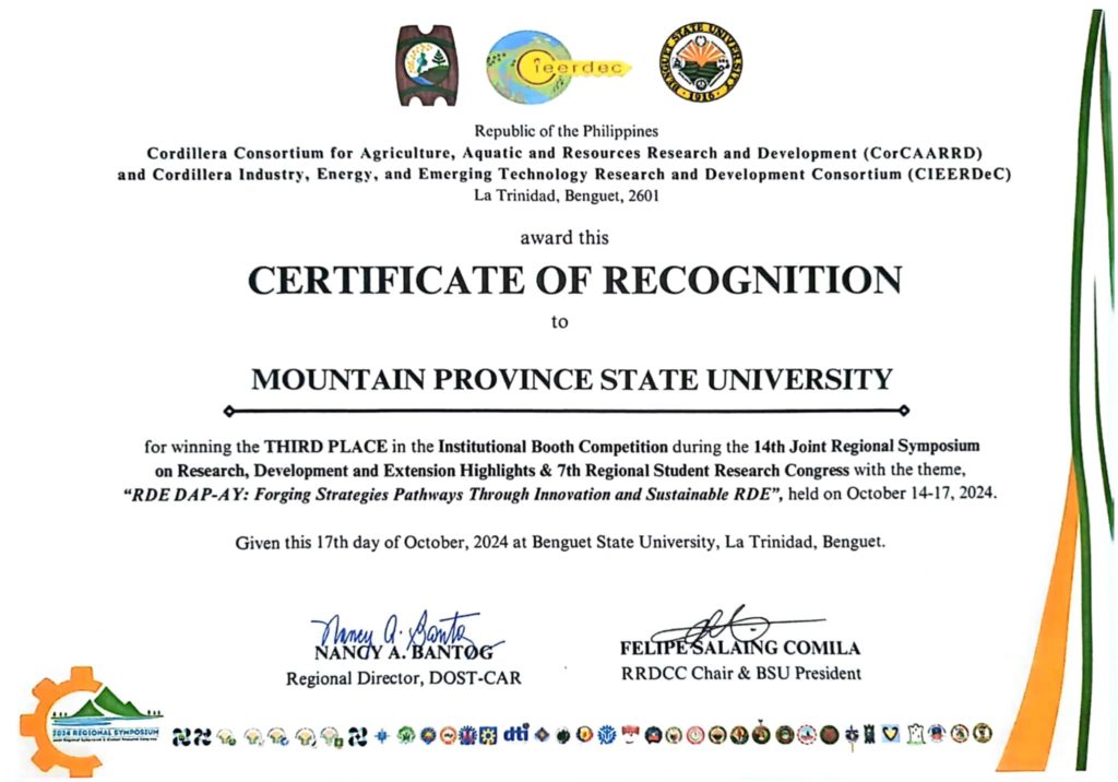 Faculty presenters from MPSU included Jaccy Dumaliw with his research “Landslide Susceptibility Mapping in Tadian, Mountain Province” and Joyce Cuyangoan, who presented “Potential of Golden Apple Snail (Pomacea canaliculata) Meat in Sausage.” In the Education Category, Rollie C. Mejia examined “Board Examination Performance and Academic Performance of Civil Engineering Graduates at Mountain Province State Polytechnic College: Basis for System and Policy Formulation.” The Socio-Cultural Category featured Luzlyn M. Agwilang, who presented “Exploring the Factors Influencing Organizational Commitment in a Public Higher Education Institution,” and Jonnelle Fagsao, who shared “Gastronomic ‘Imontanyosa’ Cuisine in the Light of Theoretical Onomastics: A Preliminary Study.”