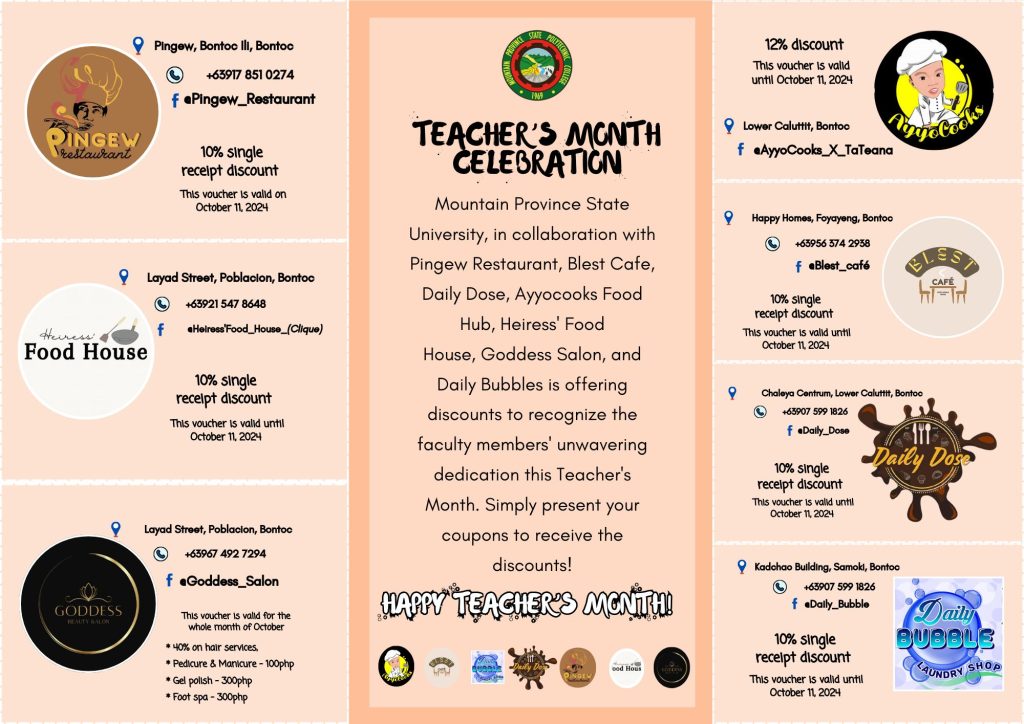 The Mountain Province State University, in collaboration with Pingew Restaurant, Blest Cafe, Daily Dose, Ayyocooks Food Hub, Heiress’ Food House, Goddess Salon, and Daily Bubbles is offering discounts to recognize its faculty members’ unwavering dedication for quality education and resilient and productive learners.