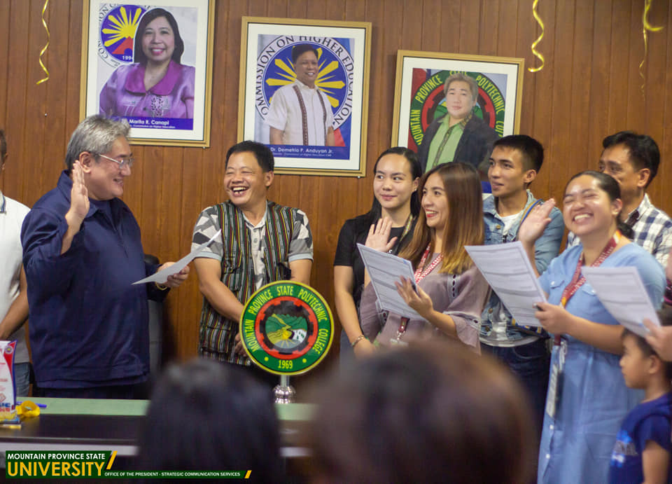 Witnessing the oath taking were Political Affairs Officer III from the Office of the Congressman, Mr. Erlindo Agwilang; Executive Assistants from the Office of the Governor Mr. Aqueles P. Agnapan and Mr. June C. Pinayakan; Vice President for Academic Affairs Dr. Geraldine L. Madjaco; Vice President for Administration and Finance Represented Mr. Reynaldo P. Gayo, Jr., represented by OIC-Legal Officer Atty. Evelyn A. Marrero and Budget Officer Ms. Norma W. Akilith; Office of the President Executive Assistant Atty. Dublin O. Facullo; Bontoc Campus Director Dr. Arel B. Sia-ed; and the appointees family members and co-office workers.