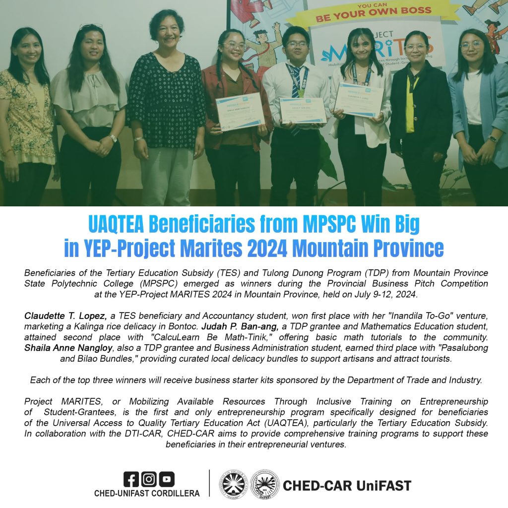 Beneficiaries of the Tertiary Education Subsidy (TES) and Tulong Dunong Program (TDP) from Mountain Province State Polytechnic College (MPSPC) emerged as winners during the Provincial Business Pitch Competition at the YEP-Project MARITES 2024 in Mountain Province, held on July 9-12, 2024.