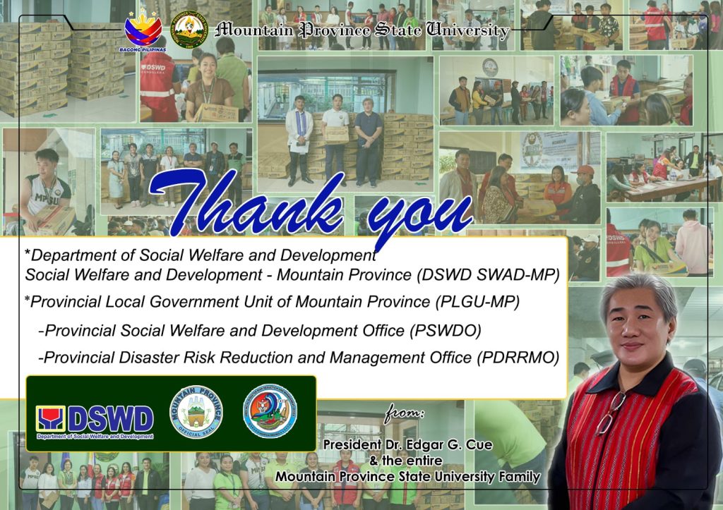 Mountain Province State University extends heartfelt gratitude to DSWD SWAD-MP, PLGU-MP, PSWDO, and PDRRMO for your timely relief assistance provided to our MPSU students stranded during Typhoon Uwan. Your resolute support and swift response embody the true spirit of community and compassion. Thank you for standing with our students in this time of need.