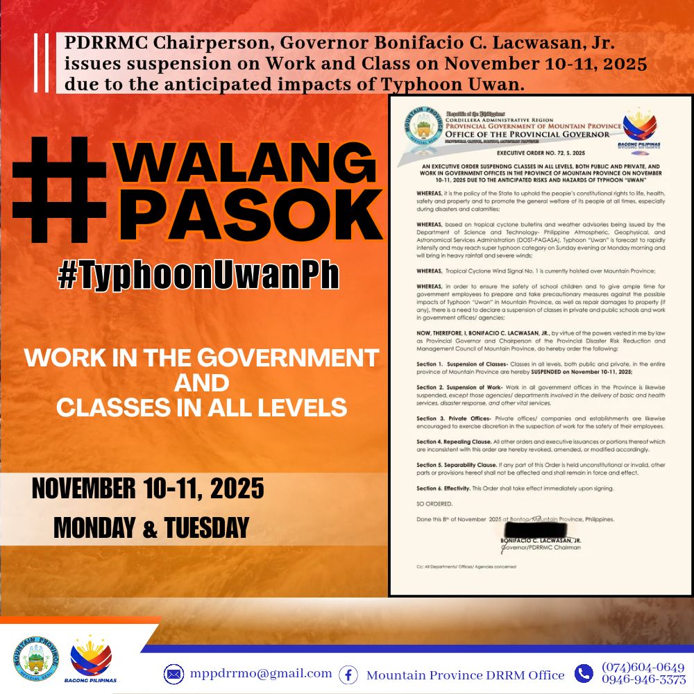 The Provincial Government of Mountain Province, through Executive Order No. 72 s. 2025 issued by Governor Bonifacio C. Lacwasan, Jr., has suspended all classes (public and private, all levels) and work in government offices on November 10–11, 2025 (Monday–Tuesday) due to the anticipated risks and hazards of Typhoon Uwan.
