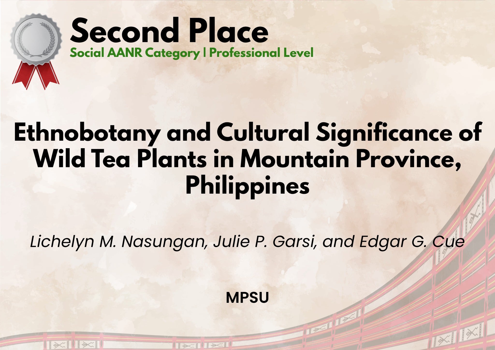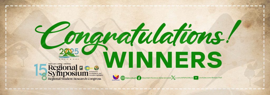 The Mountain Province State University proudly commends its personnel and student who won at the recently concluded 15th Joint CorCAARRD-CIEERDeC Regional Symposium on Research, Development and Extension Highlights & 8th Regional Student Research Congress at IFSU, Lamut, Nayon, Ifugao.