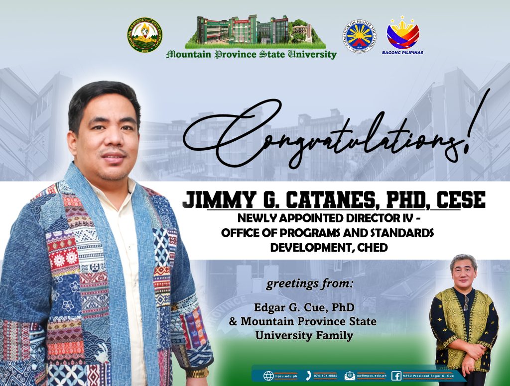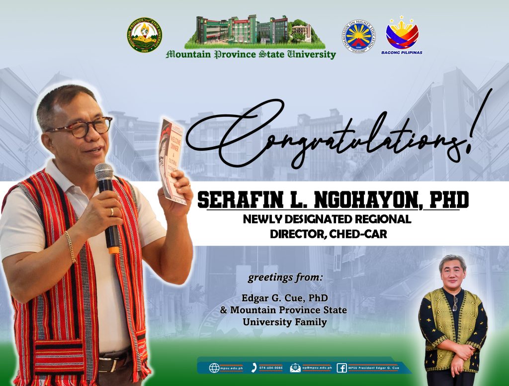 Mountain Province State University, through its President Dr. Edgar G. Cue, extends its heartfelt congratulations to Dr. Serafin L. Ngohayon on his designation as the Regional Director of CHEDโCordillera Administrative Region (CHEDโCAR), and to Dr. Jimmy G. Catanes, CESE on his appointment as Director IV โ Office of Programs and Standards Development, CHED Central Office.