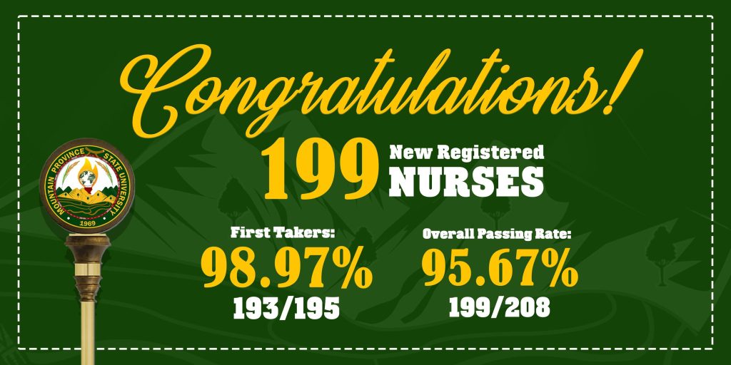 𝗖𝗢𝗡𝗚𝗥𝗔𝗧𝗨𝗟𝗔𝗧𝗜𝗢𝗡𝗦|| The Mountain Province State University proudly congratulates the College of Healthcare Education for its impressive 95.67% Overall Passing Rate for the November 2025 Philippine Nurses Licensure Examination. 199 out of 208 examinees from the University passed the exam.