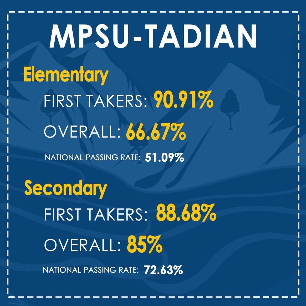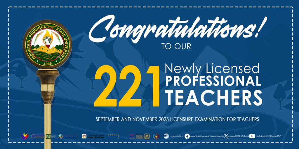 The Mountain Province State University proudly congratulates its 221 alumni who are among the 21,967 elementary teachers out of 43,035 examinees (51.04%) and 57,729 secondary teachers out of 79,493 examinees (72.62%) who successfully passed the September and November 2025 Licensure Examination for Teachers.