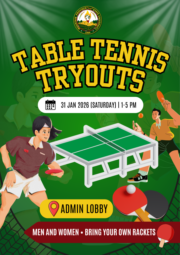 HEADS UP MPSUans|| The University will be holding Table Tennis Tryouts on 31 January 2026 (Saturday), 1:00โ5:00 PM at the Admin Lobby.