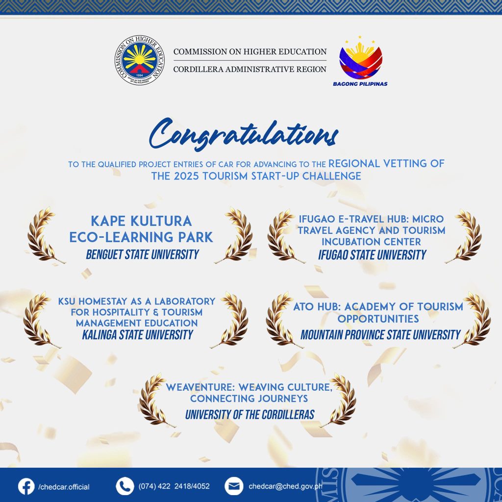 Mountain Province State University (MPSU) proudly marks a significant achievement as it advances to the Regional Vetting of the 2025 Tourism Start-Up Challenge through its project, “ATO Hub: Academy of Tourism Opportunities,” following its successful presentation during the Provincial Vetting held on January 28–29, 2026, at the CHED–CAR CARASUC Hall in La Trinidad, Benguet, led by the Department of Tourism–CAR and the Commission on Higher Education–CAR.