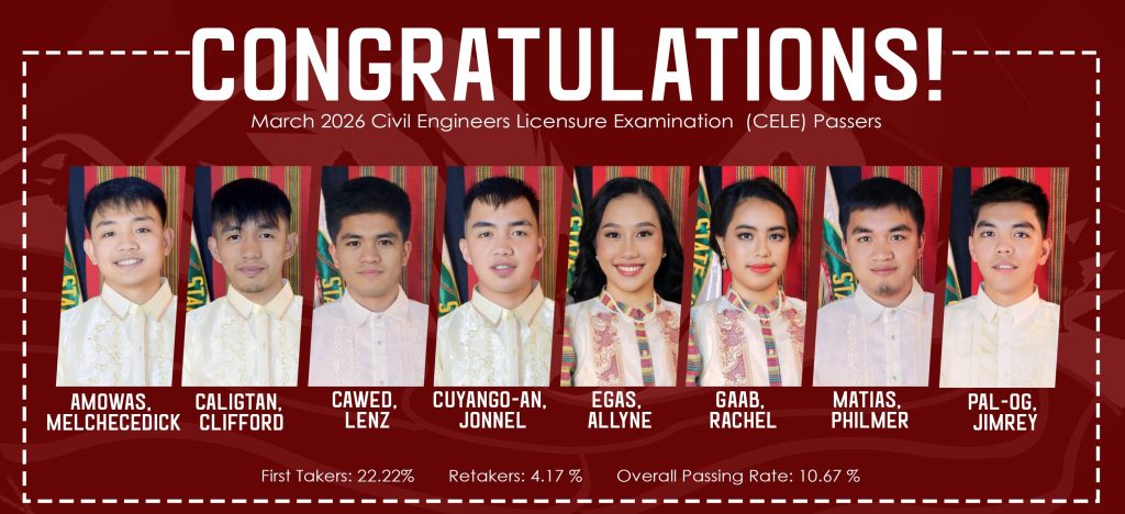 Congratulations to our newly Registered Civil Engineers: Melchecedick Amowas, Clifford Caligtan, Lenz Cawed, Jonnel Cuyango-an, Allyne Egas, Rachel Gaab, Philmer Matias, and Jimrey Pal-og.